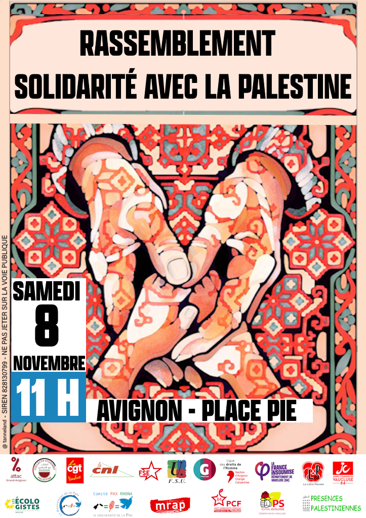 Le collectif « Cessez-le feu » appelle à un rassemblement solidaire pour la Palestine, samedi 8 novembre 2025 à 11h00 Place Pie à Avignon