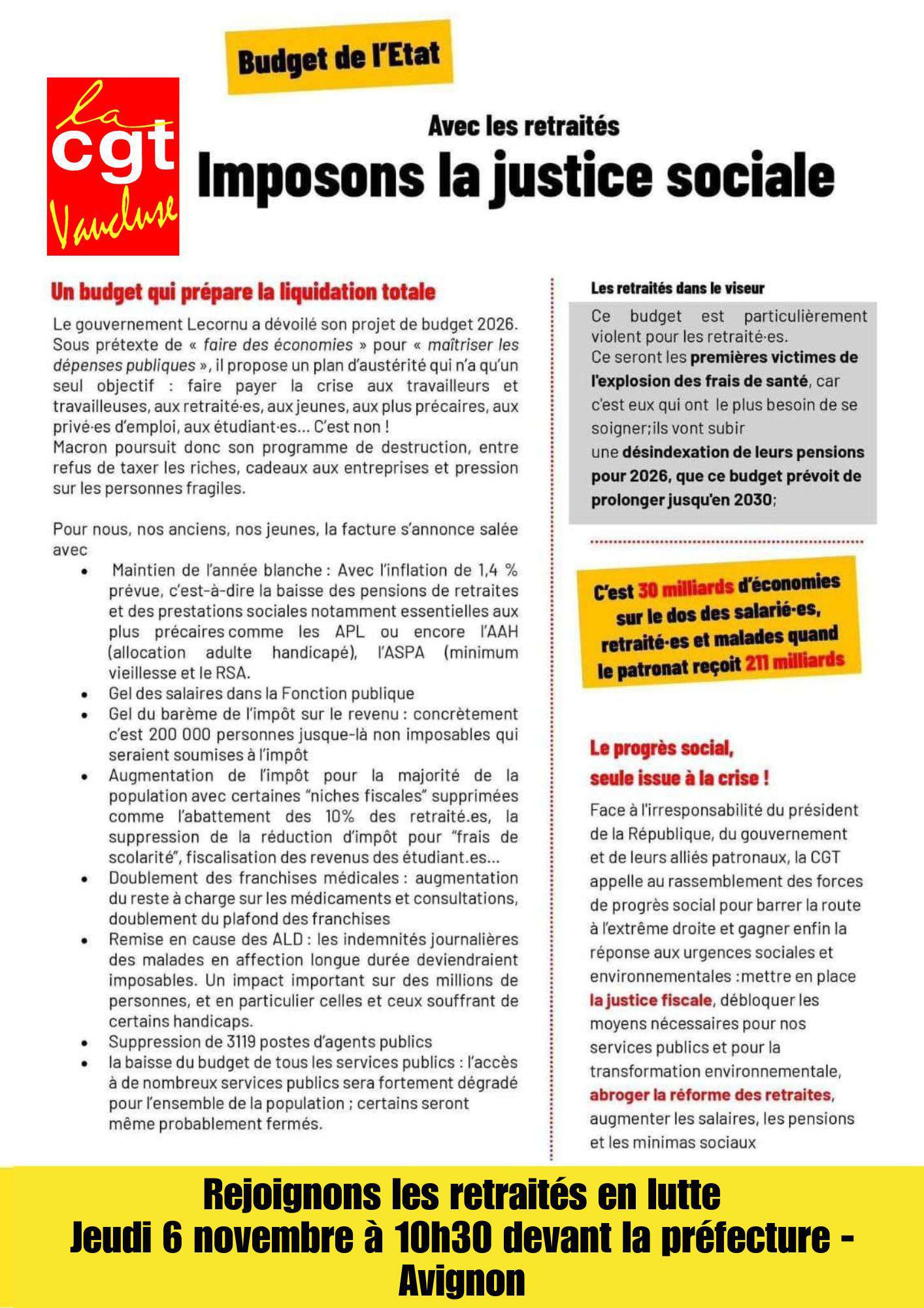 L’union départementale des syndicats CGT de Vaucluse appelle les camarades disponibles à participer massivement au rassemblement du 6 novembre 2025 à 10h30 devant la Préfecture pour soutenir les camarades retraité.es dans la lutte.