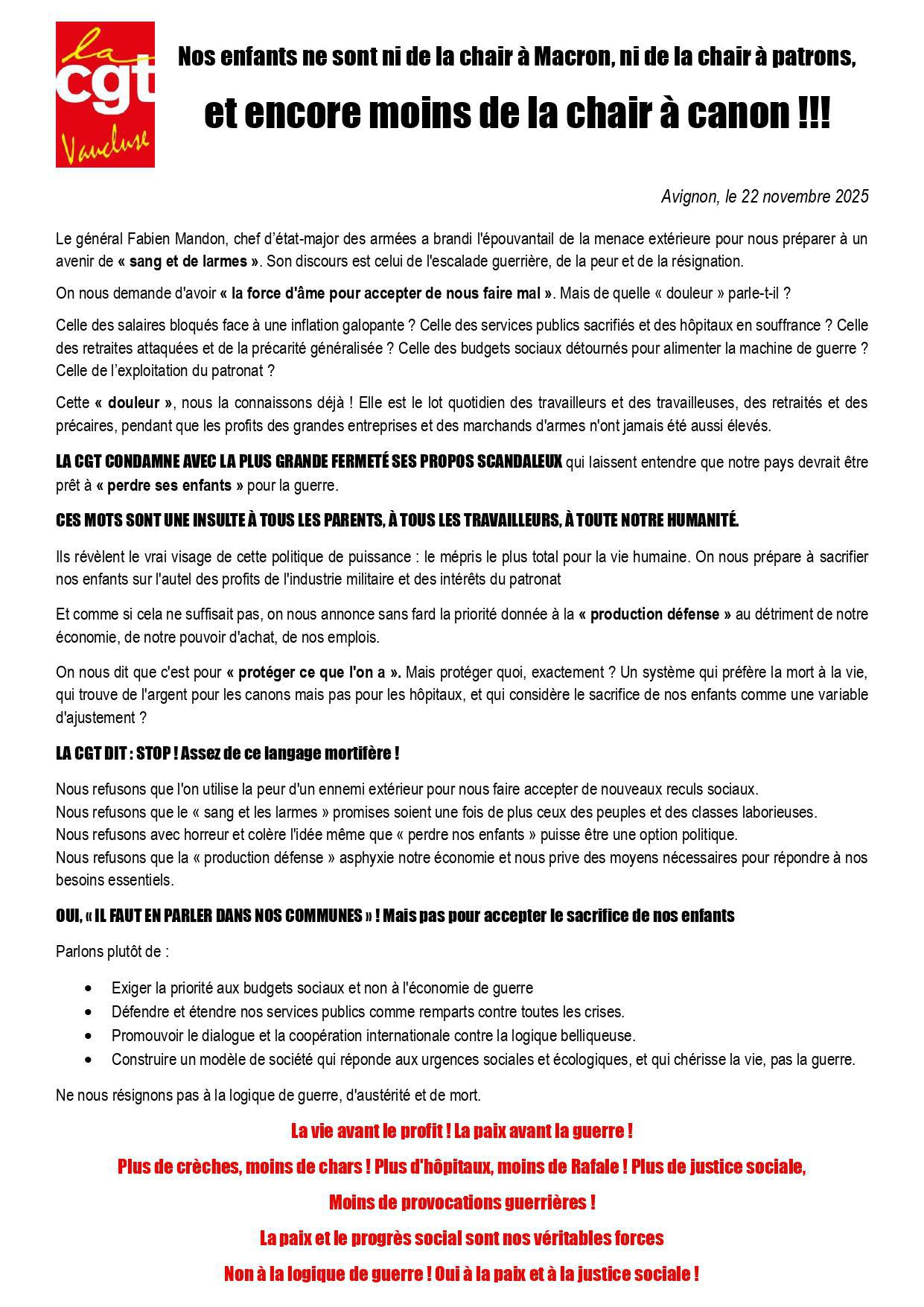 Communiqué de l'Union Départementale des syndicats CGT de Vaucluse